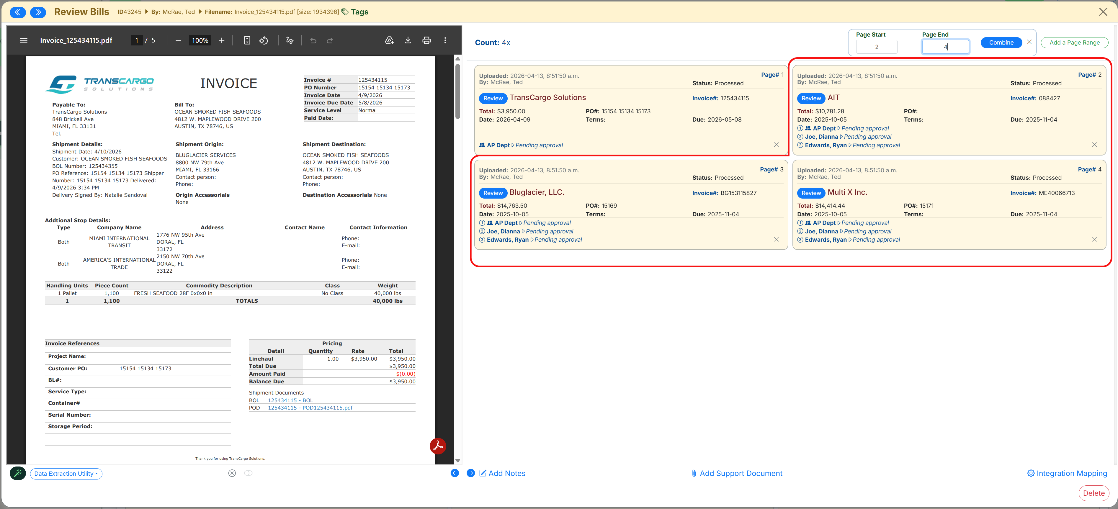 • Users can specify which pages should supply the invoice data during the combine action.