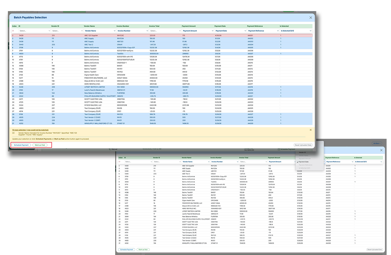 • Reconcile uploaded rows against outstanding payables, flag mismatches, and complete scheduling or mark-as-paid actions in one flow.
