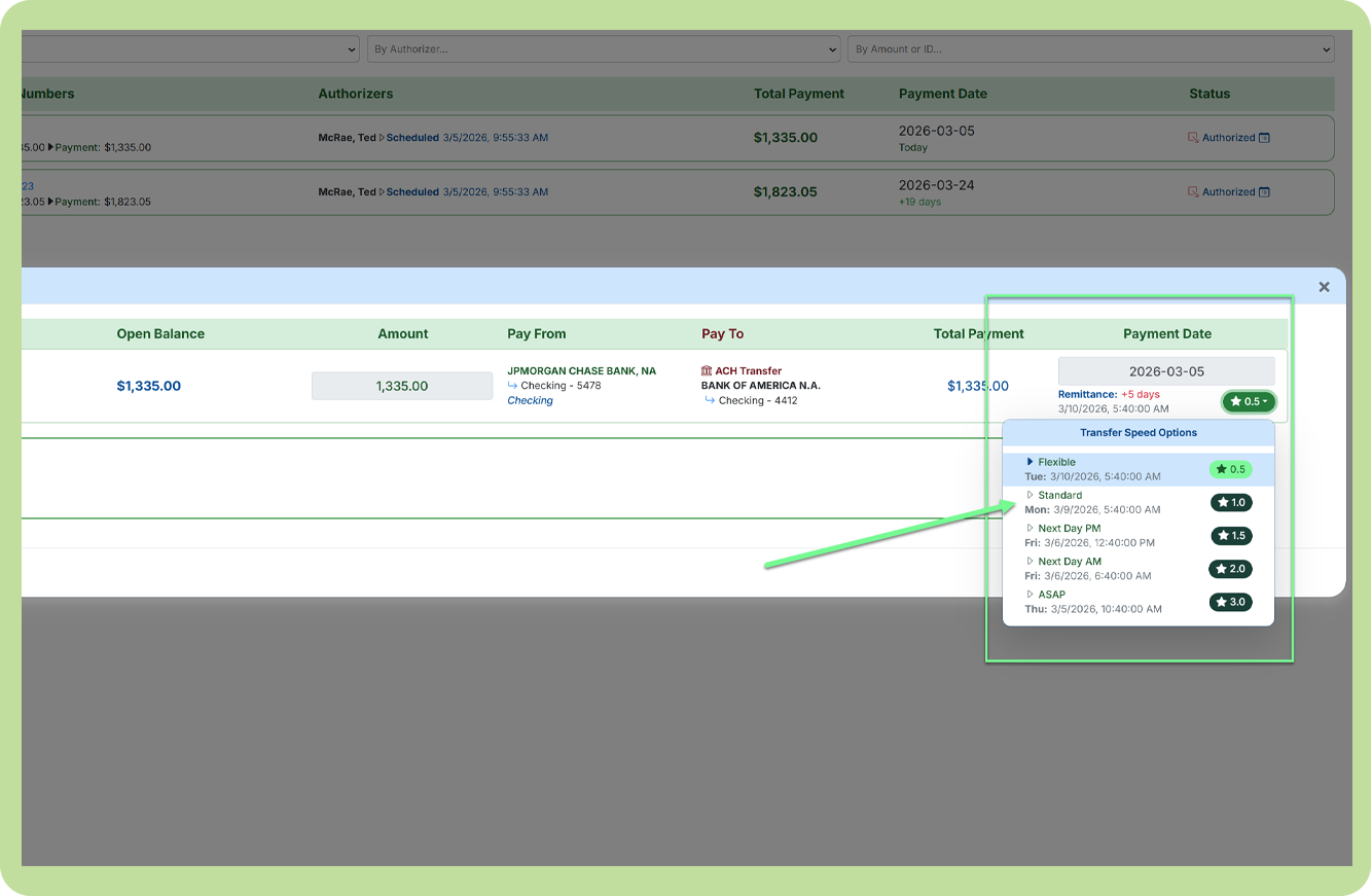 Set default ACH and Check transfer speeds in Payment Settings, with per-payment overrides available